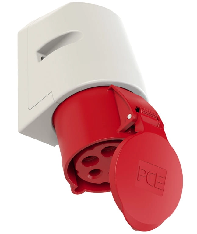 Gniazdo stałe firmy PCE o nominalnym prądzie 32A i 5 pinach, zgodne z normą IP44, zapewniające wysoką jakość oraz niezawodność.