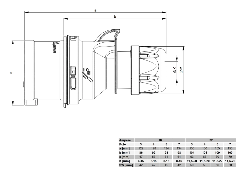 Ta wtyczka siłowa 16A, przeznaczona do instalacji z napięciem 400V (50/60 Hz), to solidne rozwiązanie zapewniające bezpieczne i niezawodne połączenie w trudnych warunkach. Zbudowana zgodnie z normą EN 60309-2, wtyczka posiada pięć biegunów i jest łatwo rozpoznawalna dzięki czerwonej barwie (RAL 3000).