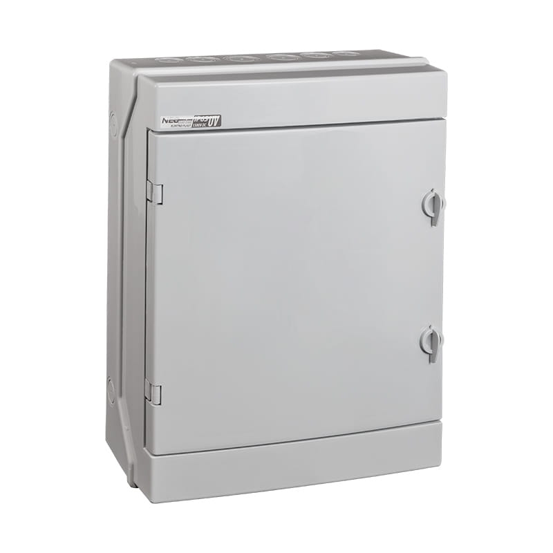 Szafka wykonana z wytrzymałego tworzywa sztucznego w kolorze szarym, posiada wbudowaną szynę montażową do łatwego instalowania aparatów elektrycznych, takich jak wyłączniki nadprądowe i inne urządzenia modułowe. Drzwi szafki są pełne, nie posiadają mechanizmu zamka.