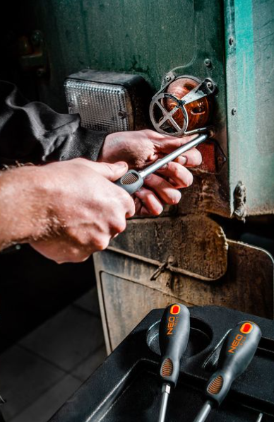 Trójgraniasty kształt uchwytu z wyprofilowanym oparciem dla kciuka zmniejsza obciążenie dłoni podczas pracy i ułatwia uzyskanie optymalnego momentu obrotowego. Uchwyt dwumateriałowy zapobiega ślizganiu się w dłoni, odporny jest na działanie chemikaliów, olejów i smarów.