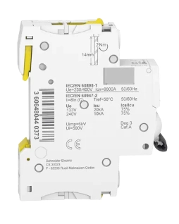 Wyłącznik nadprądowy serii iC60N, o numerze katalogowym A9F04120, 1-biegunowy (jednobiegunowy), 20A, charakterystyka C. Wytrzymałość zwarciowa 6kA, zapewnia ochronę przed zwarciami i przeciążeniami. Umożliwia bezpośrednie podłączenie dwóch przewodów o różnych przekrojach. Optyczny wskaźnik Visi-Trip wyzwolenia elektrycznego, biało-czerwony. Istnieje możliwość demontażu pojedynczego aparatu bez potrzeby zdejmowania szyny łączeniowej i bez użycia narzędzi. Klasa ograniczenia 3 (zgodnie z normą EN/IEC60898-1) poprawia koszt ochrony obwodu odpływowego. Unikalny wskaźnik Visitrip skraca czas interwencji, pokazując uszkodzony obwód.