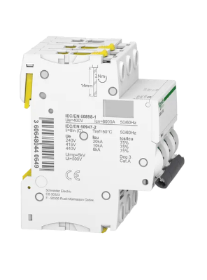 Wyłącznik nadprądowy serii iC60N, o numerze katalogowym A9F04310, 3-biegunowy (trójbiegunowy)o prądzie znamionowym 10A z charakterystyka C. Wytrzymałość zwarciowa 6kA, zapewnia ochronę przed zwarciami i przeciążeniami. Umożliwia bezpośrednie podłączenie dwóch przewodów o różnych przekrojach. Posiada optyczny wskaźnik Visi-Trip wyzwolenia elektrycznego w kolorze biało-czerwony. Istnieje możliwość demontażu pojedynczego aparatu bez potrzeby zdejmowania szyny łączeniowej i bez użycia narzędzi. Klasa ograniczenia 3 (zgodnie z normą EN/IEC60898-1) poprawia koszt ochrony obwodu odpływowego. Unikalny wskaźnik Visitrip skraca czas interwencji, pokazując uszkodzony obwód.