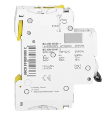 Wyłącznik nadprądowy serii iC60N, o numerze katalogowym A9F04116 1-biegunowy (jednobiegunowy) 16A. Wytrzymałość zwarciowa 6kA zapewnia ochronę przed zwarciami i przeciążeniami. Istnieje możliwość bezpośredniego podłączenia dwóch przewodów o różnych przekrojach. Posiada optyczny wskaźnik Visi-Trip wyzwolenia elektrycznego w kolorze biało-czerwony, skraca czas interwencji, pokazując uszkodzony obwód. Bez zdejmowania szyny łączeniowej można zdemontować pojedynczy aparat. Jego Klasa ograniczenia 3 (zgodnie z normą EN/IEC60898-1) poprawia koszt ochrony obwodu odpływowego.